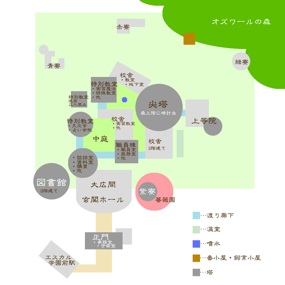 また、学園の北側には【オズワールの森】、南側にはバラ園が広がっています。